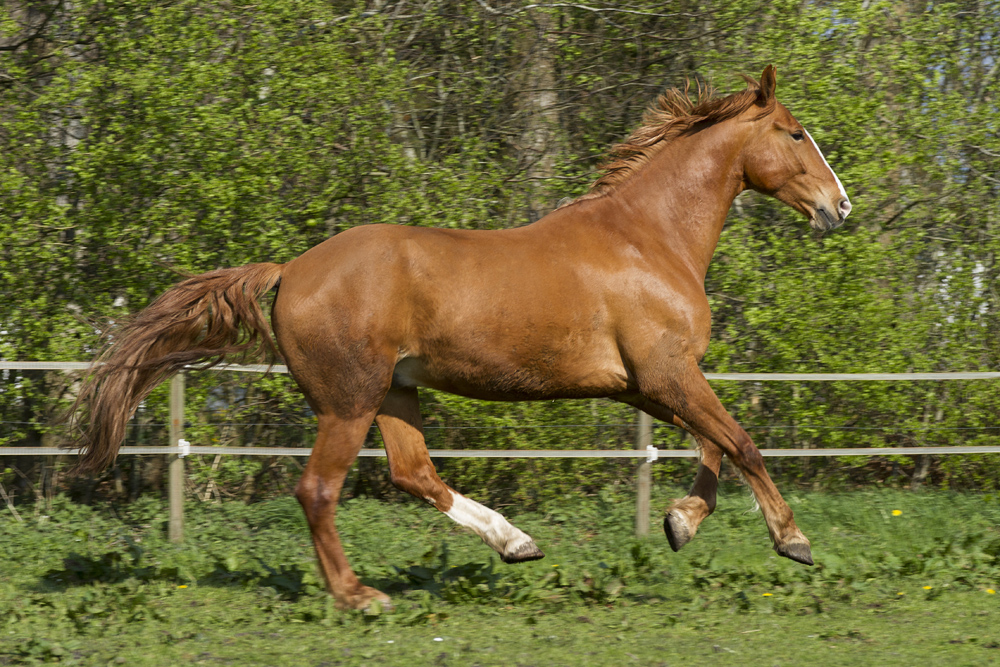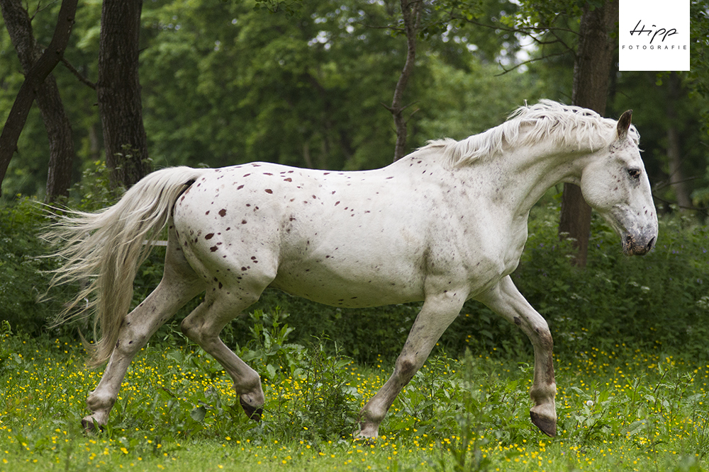 Calimero ist der neueste Zugang in unserem Stall. Er ist eine interessante Mischung aus Frederiksborger (nein, er ist kein Knabstruper und war mal braun mit weißen Stichelhaaren!) und Trakehner, was sich auch deutlich in seinem Willen und Ehrgeiz erkennen lässt. Leider (oder vielleicht auch zum Glück für ihn) wurde Calimero nach dem Anreiten nur hin und wieder mal zum Ausreiten genutzt und wegen privater Probleme seines Besitzers die letzten zwei Jahre ganz auf eine Weide abgeschoben. Wir holten ihn zu uns und schnell war klar: Calimero wollte zeigen was in ihm steckt! Seitdem erstaunt er uns immer wieder mit seiner schnellen Auffassungsgabe, seinem Lerneifer und seinen körperlichen Fähigkeiten, was bei seinem ungünstigen Körperbau immer wieder überraschend ist (er war wirklich ein erbärmlicher Anblick als wir ihn das erste Mal auf der Weide sahen).